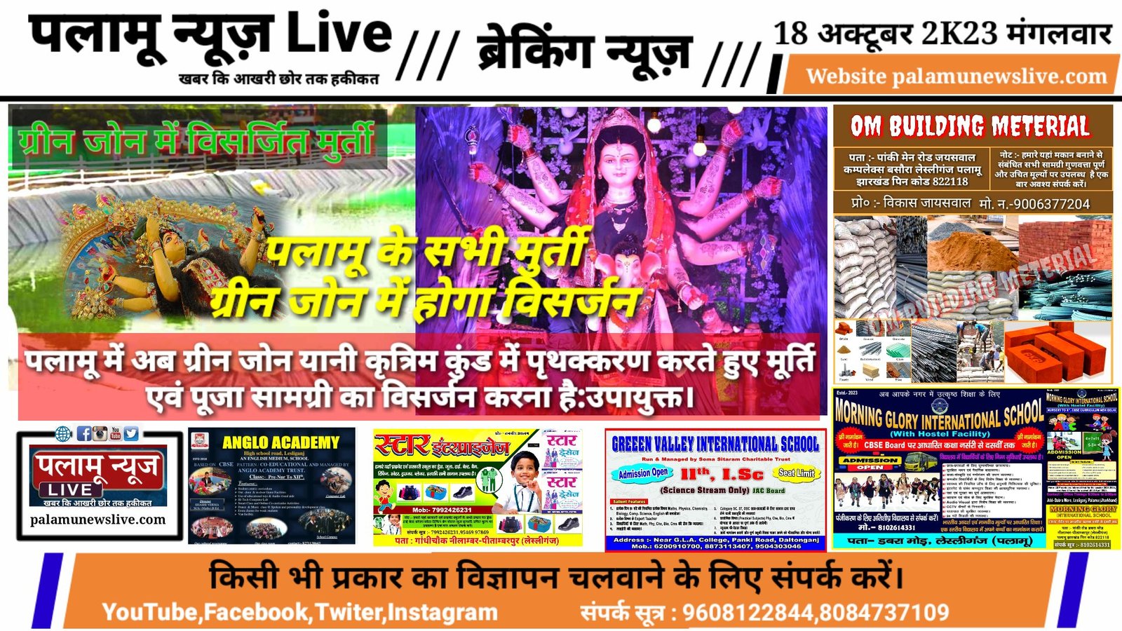 पलामू न्यूज Live//पलामू जिले के सभी दुर्गा पूजा पंडालो में स्थापित मूर्तियों के विसर्जन हेतु अब दिशा निर्देशों को विकसित करने की आवश्यकता महसूस की गई है। इसके मद्देनजर इस वर्ष एनजीटी एवं झारखण्ड प्रदूषण नियंत्रण बोर्ड के अनुसार पलामू जिला अंतर्गत सभी दुर्गा पूजा समितियों के सहयोग से सभी मूर्तियों का विसर्जन तालाब, नदी आदि में न करके कृत्रिम जल कुंड यानी ग्रीन जोन में विसर्जन करने हेतु प्रेरित करेंगे एवं वांछित सहयोग प्रदान करेंगे। उक्त के आलोक में जिला प्रशासन पलामू द्वारा ऐसे निकायों का पालन करने वाले पर्यावरण संरक्षण में सहयोग करने वाले पूजा समिति जिला स्तर पर आयोजन होने वाले “आस्था से स्वच्छता” प्रतियोगिता में भाग ले सकेंगे। “आस्था से स्वच्छता” प्रतियोगिता में प्रथम पुरस्कार के रूप में 50 हजार रुपए द्वितीय पुरस्कार के रूप में 25 हजार रुपए और तृतीय पुरस्कार के रूप में 10 हजार रुपए की राशि प्रदान की जाएगी।