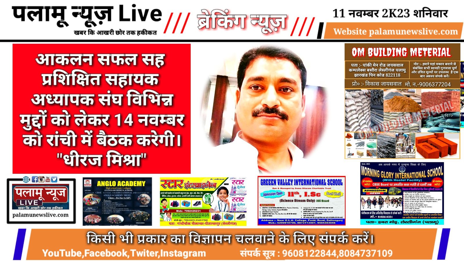 पलामू न्यूज Live// झारखण्ड के आकलन सफल एवं प्रशिक्षित सहायक अध्यापक संघ के बैनर तले सहायक अध्यापको का एक आवश्यक बैठक दिनांक 14 नवम्बर 2023 दिन मंगलवार को रांची के मोरहाबादी मैदान मे आयोजित की गई है। इस बात की जानकारी आकलन सफल सह प्रशिक्षित सहायक अध्यापक संघ के प्रदेश मीडिया प्रभारी धीरज कुमार मिश्रा ने दिया साथ ही बताया कि रांची के मोरहाबादी मैदान में आयोजित बैठक का मुख्य उदेश्य। आकलन सफल सह प्रशिक्षित सहायक अध्यापक को वेतनमान की प्राप्ति, आकलन सफल अध्यापको का 10% मानदेय बढ़ोतरी, शहरी क्षेत्र में मेडिकल छुट्टी, एवं 4% इंक्रिमेंट, NC मुद्दा, छतरपुर नौडीहा के सहायक अध्यापको की सेवा समाप्ति, आकलन परीक्षा मे 2 से 3 नंबर से असफल अध्यापको का मुद्दा सहित। अन्य मुद्दों पर सरकार के सहायक अध्यापको के प्रति उदासीन एवं अड़ियल रवैए के कारण सरकार से मांग पूरा करवाने को लेकर सरकार को घेरने की रणनीति एवं आंदोलन की रूप रेखा पर चर्चा करना है। श्री मिश्रा ने आगे कहा कि झारखंड के राजधानी रांची के मोरहाबादी मैदान में आयोजित 14 नवंबर की बैठक में राज्य के तमाम आकलन सफल सह प्रशिक्षित सहायक अध्यापक एवं अध्यापिकाओ पलामू जिला के छतरपुर नौडीहा प्रखंड के सेवा समाप्त होने वाले सहायक अध्यापक को बैठक मे शामिल होने की अपील किया है।