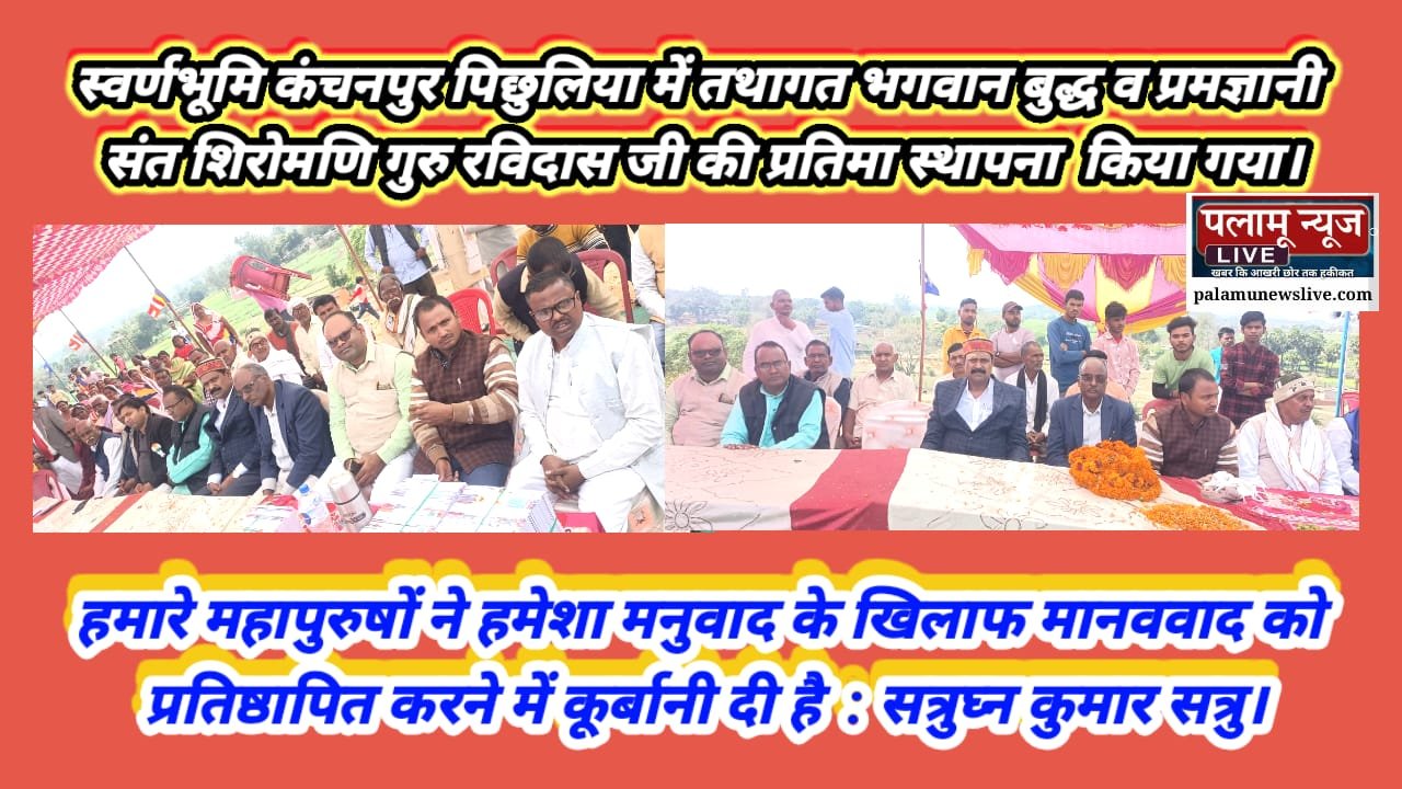 पलामू न्यूज Live//पलामू जिले के छतरपुर प्रखंड अंतर्गत कंचनपुर पिछुलिया तथागत लाॅर्ड बुद्धा ट्रस्ट छत्तरपुर के तत्वावधान में छत्तरपुर प्रखण्ड के कंचनपुर पिछुलिया ग्राम पंचायत के सर्वाधिक उंच्चाई पर स्थित स्वर्णभूमि के रमणिका नवनिर्माणाधीन बौद्ध मठ के प्रांगण में आज परमज्ञानी संत शिरोमणि श्री गुरु रविदास जी के 647 वीं जयन्ती सह प्रतिमा स्थापना समारोह का आयोजन ट्रस्ट के अध्यक्ष डा०बसंत ज्योति की अध्यक्षता में सम्पन्न हुआ। इस कार्यक्रम का सफल संचालन ट्रस्ट के सचिव शिक्षक रामजन्म राम ने किया कार्यक्रम में मुख्य अतिथि के रुप में सेवानिवृत्त आरक्षी उपाधीक्षक मान्यवर रामलाल राम व मुख्य वक्ता के रुप में झारखण्ड क्रांति मंच के संस्थापक सह केन्द्रीय अध्यक्ष शत्रुघ्न कुमार शत्रु व विशिष्ट अतिथि के रुप में झारखण्ड प्रदेश बौद्ध महासभा के अध्यक्ष रामप्रसाद बौद्ध, शिक्षक डा०नरेन्द्र प्रियदर्शी, सेवानिवृत्त शिक्षक रामजी बौद्ध, मुखिया सरस्वती देवी, मुखिया रविन्द्र राम, बसपा नेता सुहैल हक समेत समाज के गण्यमान लोग उपस्थित थे। कार्यक्रम के प्रारंभ में संत शिरोमणि श्री गुरु रविदास जी महाराज की जयन्ती पर भव्य व विशाल शोभायात्रा का नेतृत्व बौद्धाचार्य भन्ते शीलमणि व लाॅर्ड बुद्धा ट्रस्ट के सभी पदाधिकारियों ने किया। इसके बाद मुर्ति स्थापना व जयन्ती समारोह की विधिवत शुरुआत आगंतुक अतिथियों द्वारा फीता काट कर किया गया। तत्पश्चात बौद्धाचार्य भन्ते शीलमणि के निर्देशन में तथागत भगवान बुद्ध व परमज्ञानी संत शिरोमणि श्री गुरु रविदास जी की प्रतिमा के समक्ष अतिथियों द्वारा बौद्धिक तरीके से लोकार्पण, दीप प्रज्वलन व पुष्पांजलि अर्पित कर गगनभेदी नारों व पंचशील की प्रक्रियाओं के बीच सम्पादित हुआ। उक्त अवसर पर लोकल गायक धर्मेंद्र कुमार के गीतों में महापुरुषों के समाजिक परिवर्तन के गीतों पर श्रोता झूम उठे। स्थानीय शिक्षक रघु जी के निर्देशन में बालिकाओं के नृत्य, गीत की संगीतमय प्रस्तुति से वातावरण मनमोहक व बौद्धमय बन गया था। इस कार्यक्रम के अध्यक्षीय सम्बोधन में ट्रस्ट के अध्यक्ष डाॅक्टर बसंत ज्योति ने कहा कि इस इलाके के शिखर पर अवस्थित इस स्वर्णभूमि के इस निर्माणाधीन मठ में सात महापुरुषों की प्रतिमा स्थापित की जाएगी। जिसकी शुरुआत आज भगवान बुद्ध व संत शिरोमणि श्री गुरु रविदास जी की प्रतिमा स्थापना से हो रही है। वहीं कार्यक्रम में विचार व्यक्त करते हुए बौद्ध महासभा के अध्यक्ष रामप्रसाद बौद्ध, शिक्षक डाॅ नरेन्द्र प्रियदर्शी व रामजी बौद्ध ने संत शिरोमणि जी के विचारों पर प्रकाश डालते हुए कहा कि राजतंत्रीय व्यवस्था में मनुवादी भेदभाव के खिलाफ जीवन के कटू संघर्षों से गुजरते