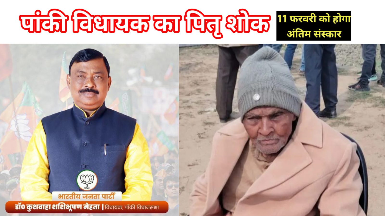 पलामू न्यूज Live// पलामू जिले के पांकी विधायक कुश्वाहा डॉ शशिभूषण मेहता जी के परम पूज्य पिताश्री शिवलोचन महतो जी का निधन 108 वर्ष की आयू में 10 फरवरी 2026 दिन मंगलवार को समय 12:02 मिनट अपराहन में हो गया है। वे 31 जनवरी से इलाजरत थे।