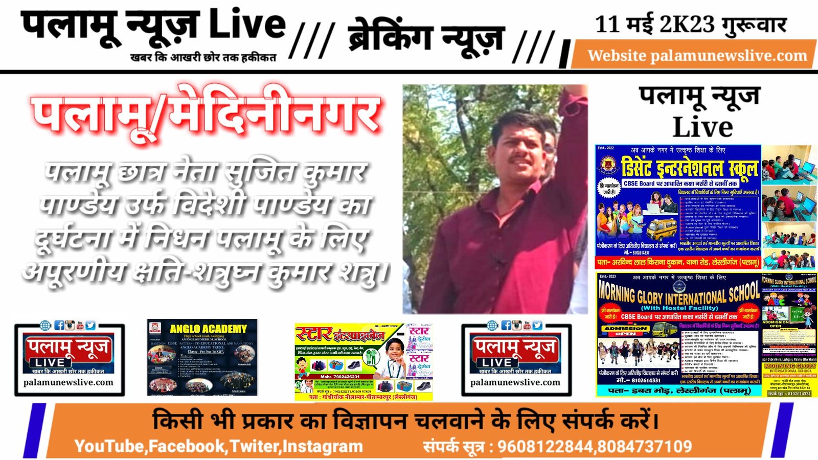 पलामू छात्र नेता सुजित कुमार पाण्डेय उर्फ विदेशी पाण्डेय का दूर्घटना में निधन पलामू के लिए अपूरणीय क्षति- शत्रुघ्न कुमार शत्रु।
