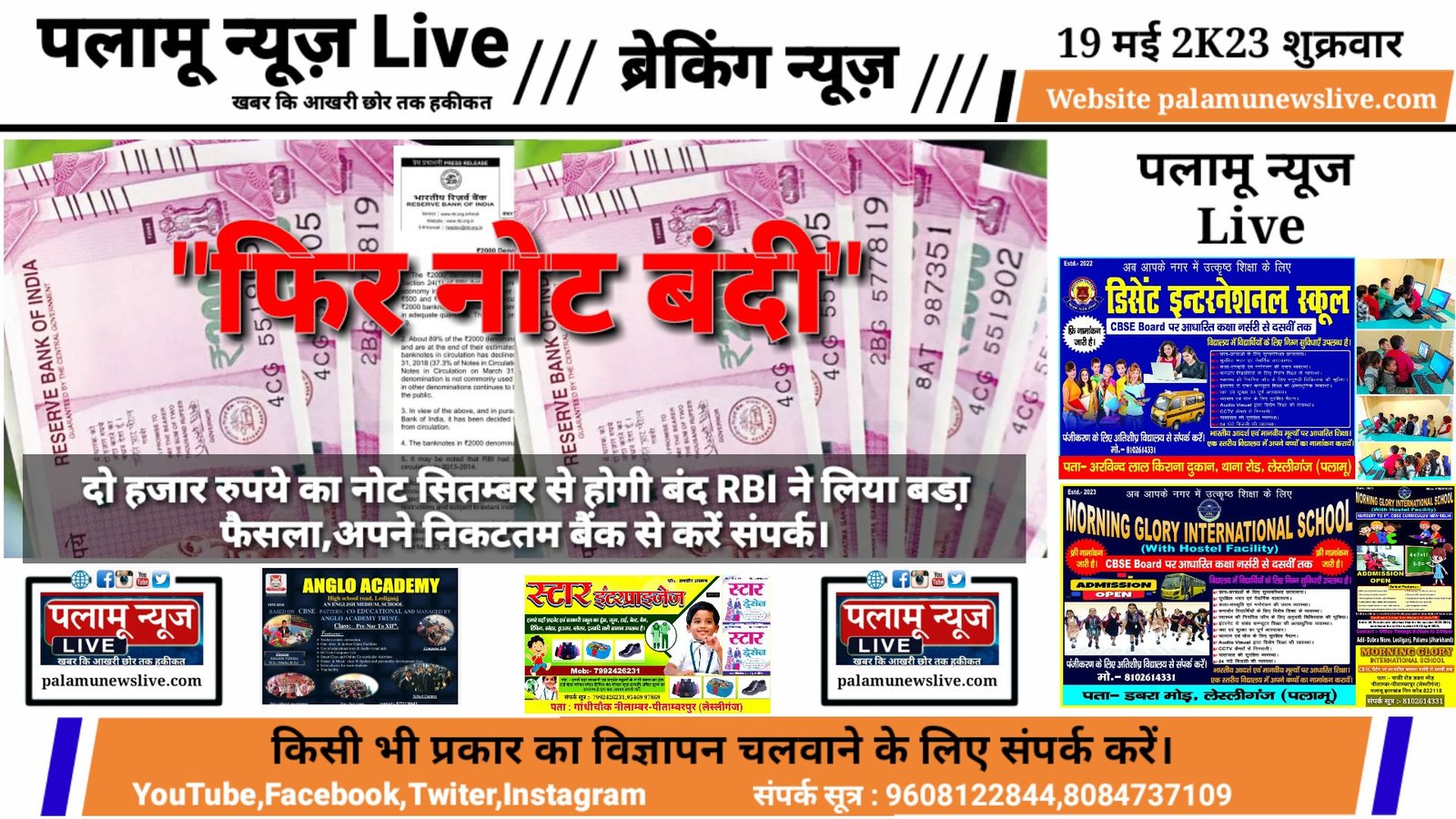पलामू न्यूज Live// नई दिल्ली दो हजार रुपये का नोट पर आरबीआई का बड़ा फैसला रिजर्व बैंक ऑफ इंडिया के अनुसार दो हजार रुपये का नोट लीगल टेंडर तो रहेगा, लेकिन इसे सर्कुलेशन से बाहर कर दिया जायेगा। भारतीय रिजर्व बैंक ने देश के अन्य बैंकों को तत्काल प्रभाव से 2 हजार रुपये के नोट जारी करना बंद करने की सलाह दी है।
